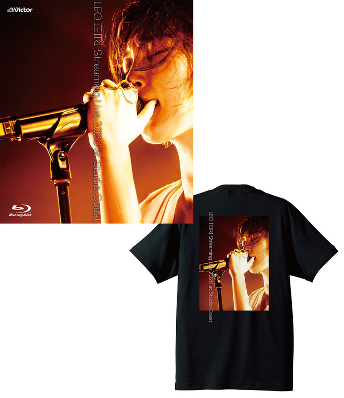 Blu-ray「LEO IEIRI Streaming Live 2020 at Studio Coast」と同作品のジャケット写真をバックプリントにした黒・Lサイズの限定Tシャツ付き商品。