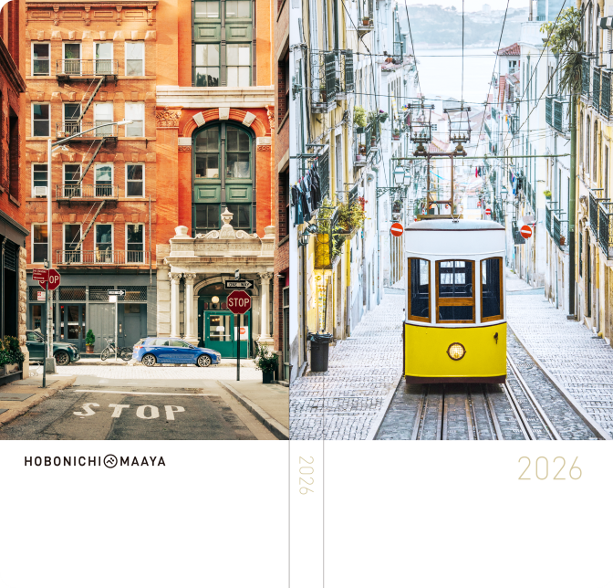 坂本真綾 ほぼ日手帳2026 weeks別注版4月はじまりの手帳です。カバービジュアルには、異なる街並みの中に坂本真綾オリジナルキャラクター「ロシナンテ」がこっそり隠れています。
