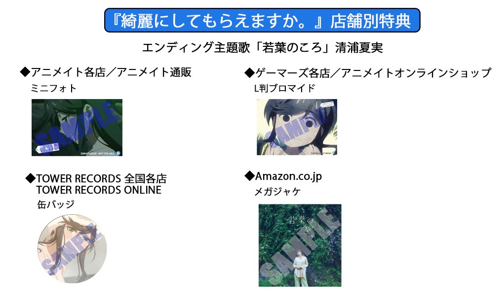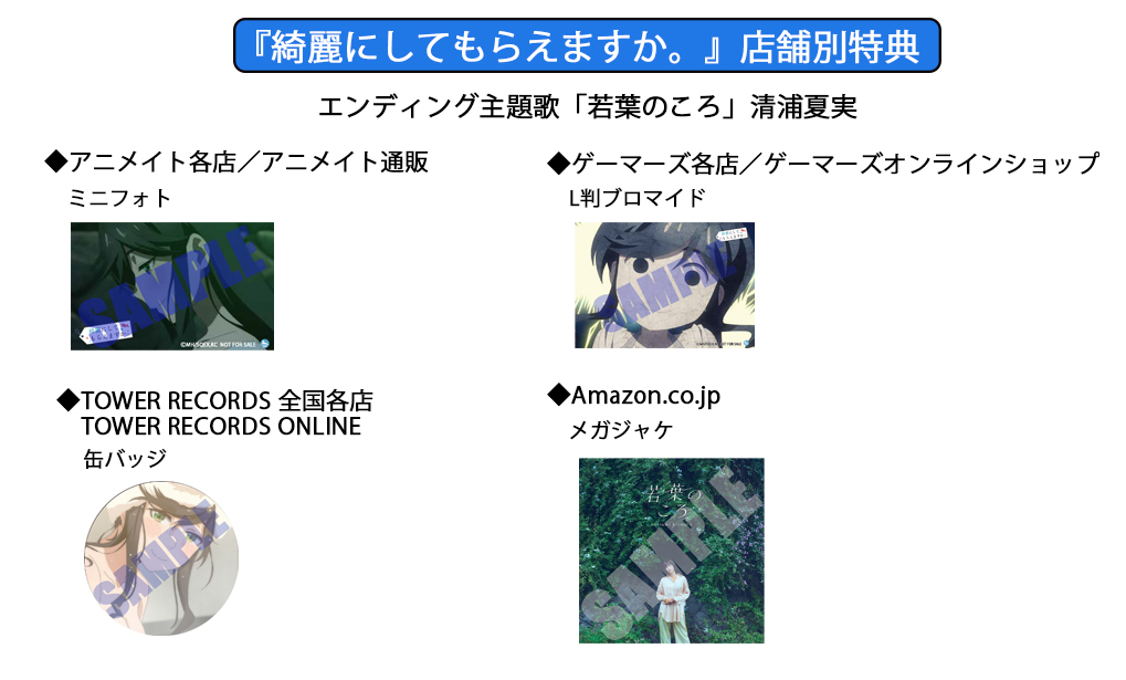 本日、TV『綺麗にしてもらえますが。』のED主題歌「若葉のころ」/清浦夏実の店舗別オリジナル特典絵柄が解禁された。アニメ主人公の金目さん表情にぜひ癒されてほしい。