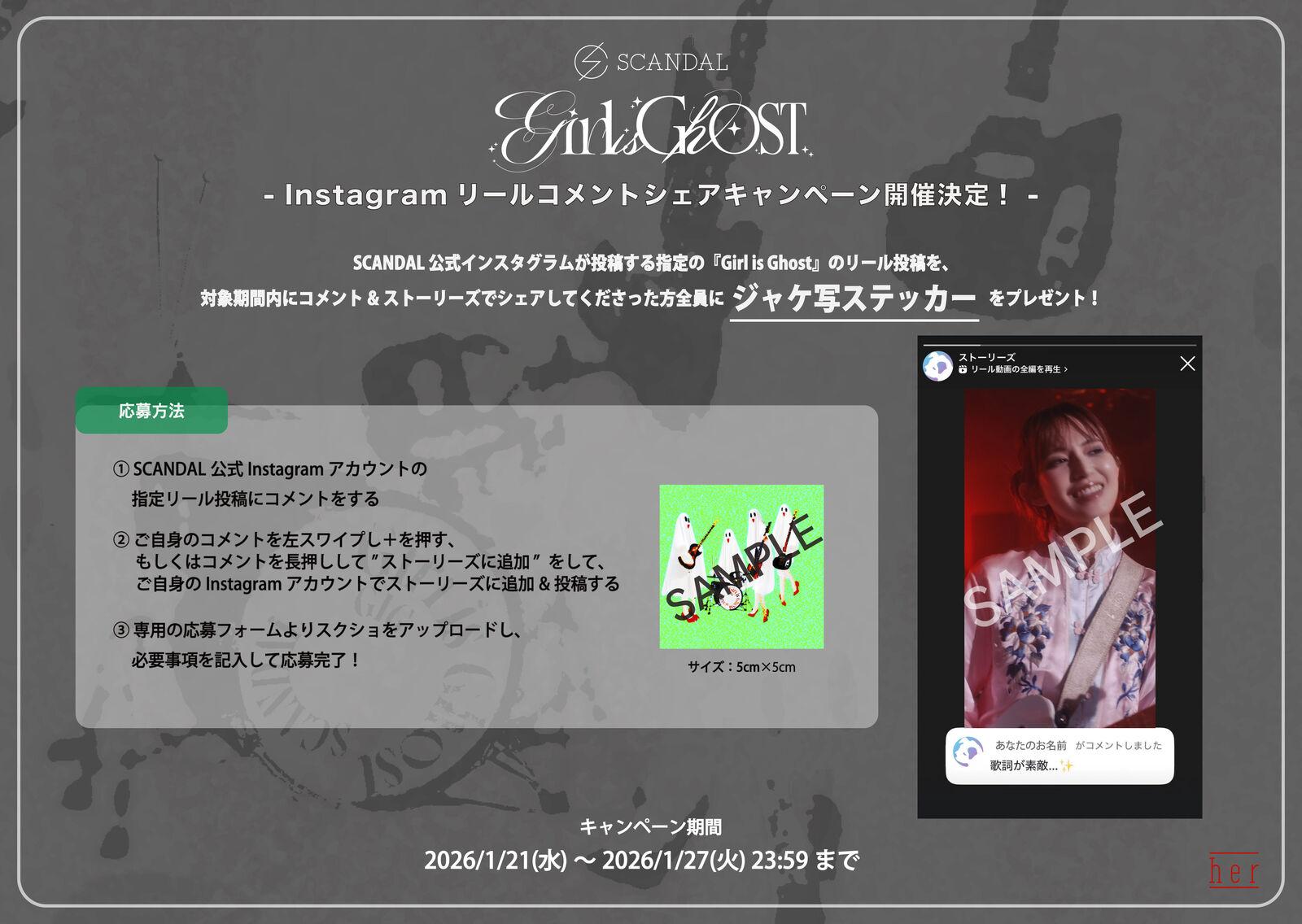SCANDAL公式インスタグラムが投稿するSCANDAL『Girl is Ghost』リール投稿を、対象期間内にコメント&ストーリーズでシェアしてくださった方全員に【『Girl is Ghost』ジャケ写ステッカー】をプレゼント!