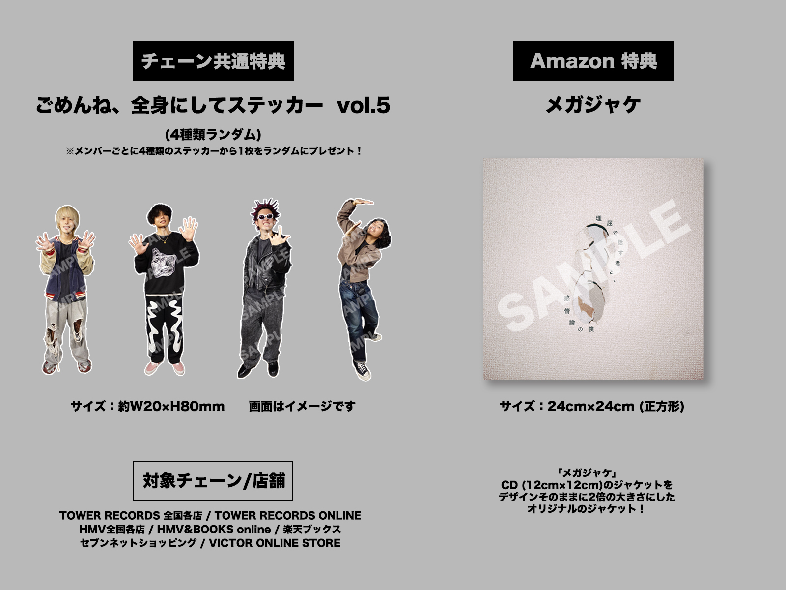 早期予約者にはメンバー直筆サイン入りアナザージャケットをプレゼント。また、対象チェーンでは先着で「ごめんね、全身にしてステッカー vol.5」(全4種ランダム)およびメガジャケが配布。ぜひ、お早めにご予約ください!