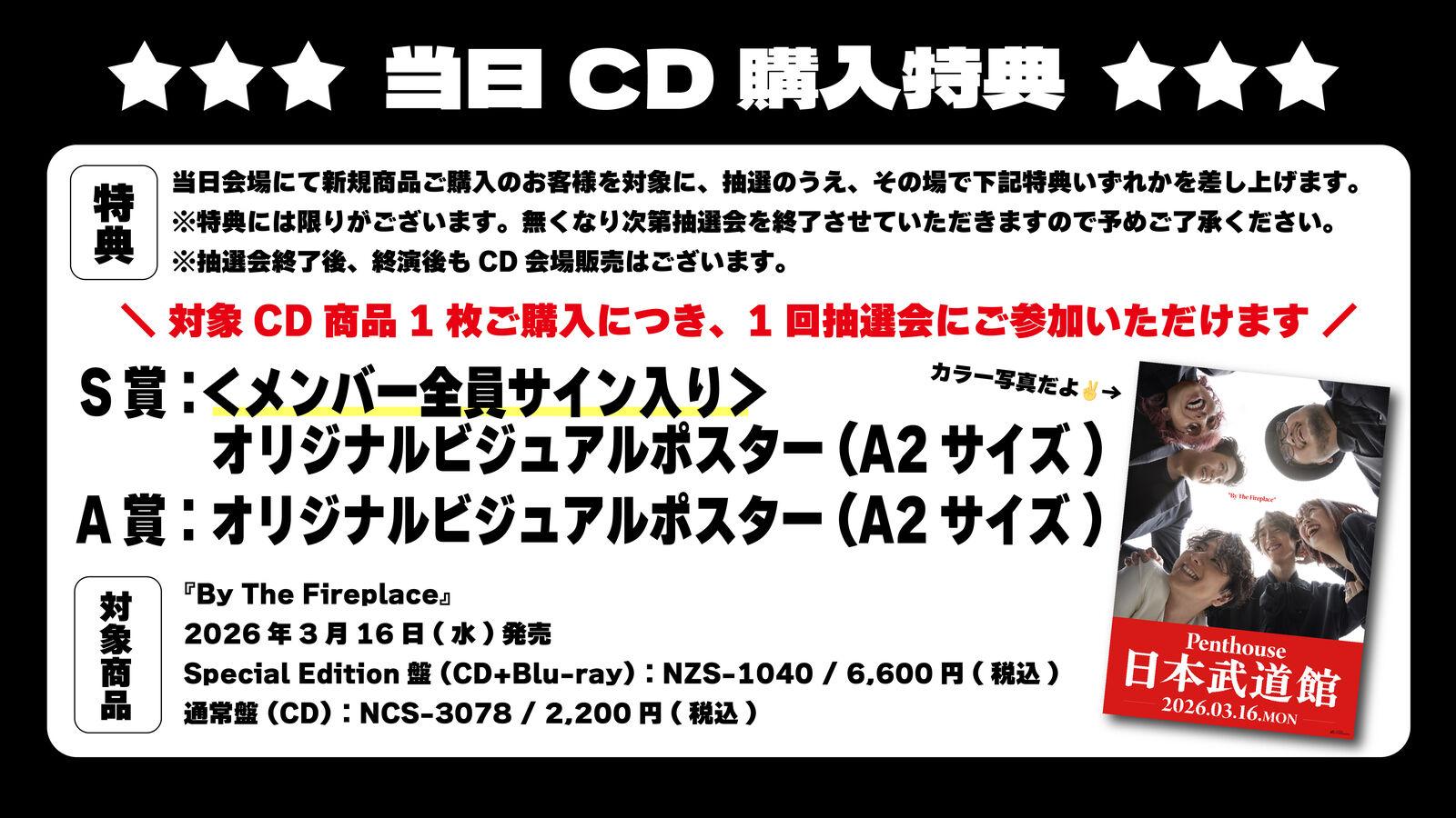 3月16日(月)開催「Penthouse ONE MAN LIVE in 日本武道館 "By The Fireplace”」CD販売ブースにて、対象CD商品1枚ご購入につき、1回抽選会にご参加いただけます。
