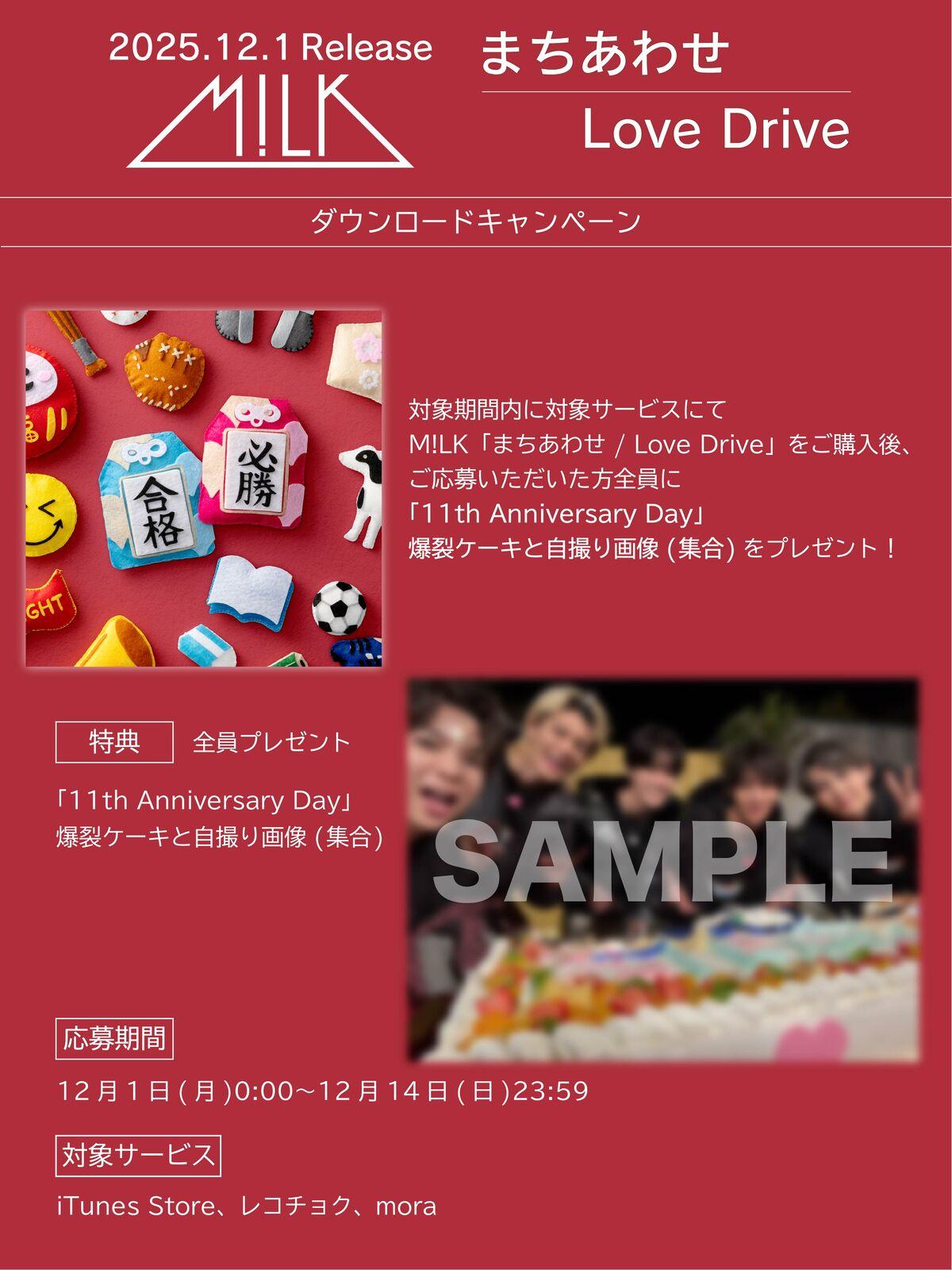 対象期間内に対象サービスにてM!LK「まちあわせ / Love Drive」をご購入後、ご応募いただいた方全員に【「11th Anniversary Day」爆裂ケーキと自撮り集合写真】をプレゼント!