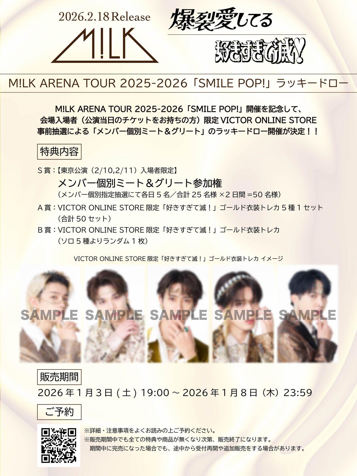M!LK ARENA TOUR 2025-2026「SMILE POP!」開催を記念して、会場入場者(公演当日のチケットをお持ちの方)限定VICTOR ONLINE STORE(以下、VOS)サイトにて事前抽選による「メンバー個別ミート&グリート」のラッキードロー(以下、ラキドロ[即時抽選])開催が決定しました。実施期間内にVOSにて対象商品(下記)をご予約いただくと、ラキドロにて特典をプレゼントいたします!ハズレ無し、特典内容もその場ですぐに当落が確認できますので、ぜひご参加ください!