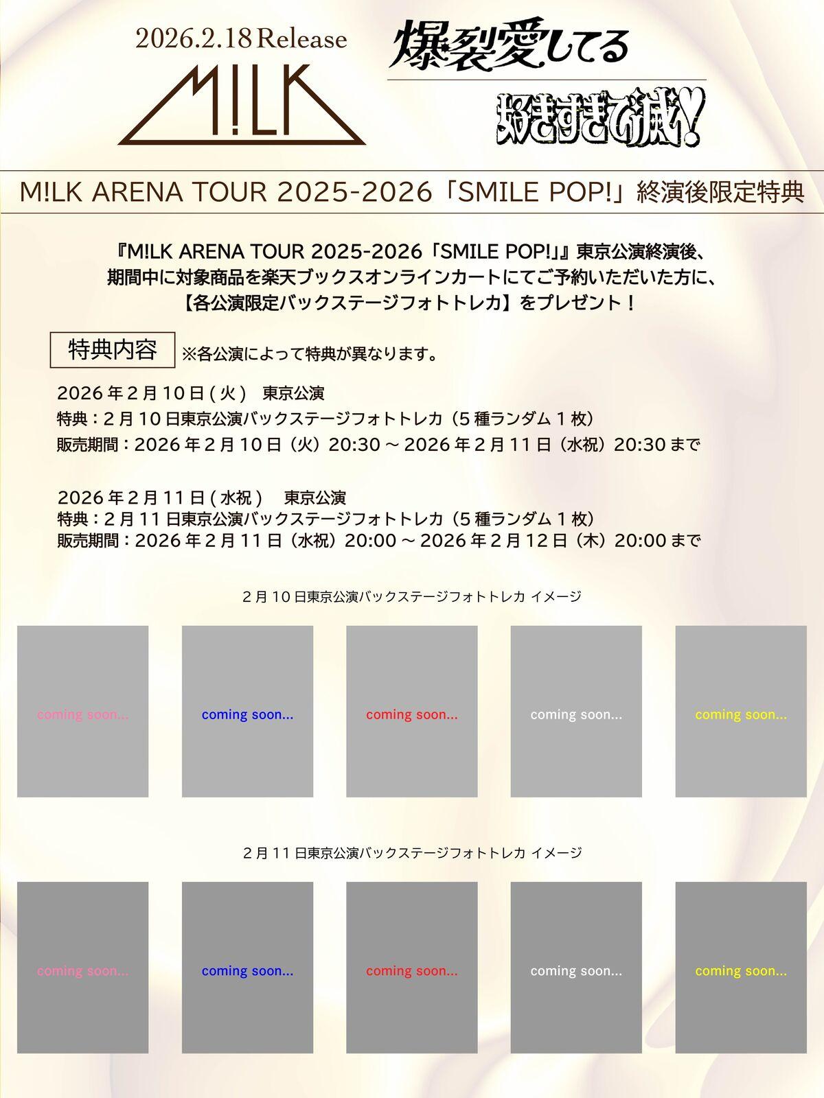 2月10日(火)、11日(水祝)開催『M!LK ARENA TOUR 2025-2026「SMILE POP!」』東京公演終演後、期間中に対象商品を楽天ブックスオンラインカートにてご予約いただいた方に、【各公演限定バックステージフォトトレカ】をプレゼント!