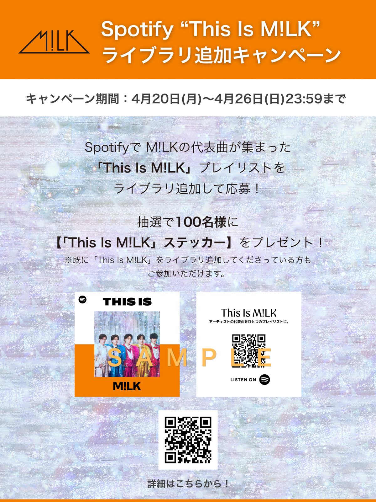 Spotifyで M!LKの代表曲が集まった「This Is M!LK」プレイリストをライブラリ追加して応募してくださった方から抽選で100名様に【「This Is M!LK」ステッカー】をプレゼント!