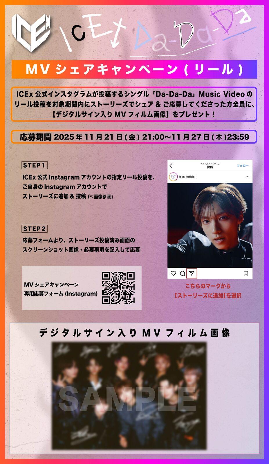 ICEx公式インスタグラムが投稿するシングル「Da-Da-Da」Music Videoのリール投稿を、対象期間内にストーリーズでシェア&ご応募してくださった方全員に、【デジタルサイン入りMVフィルム画像】をプレゼント!