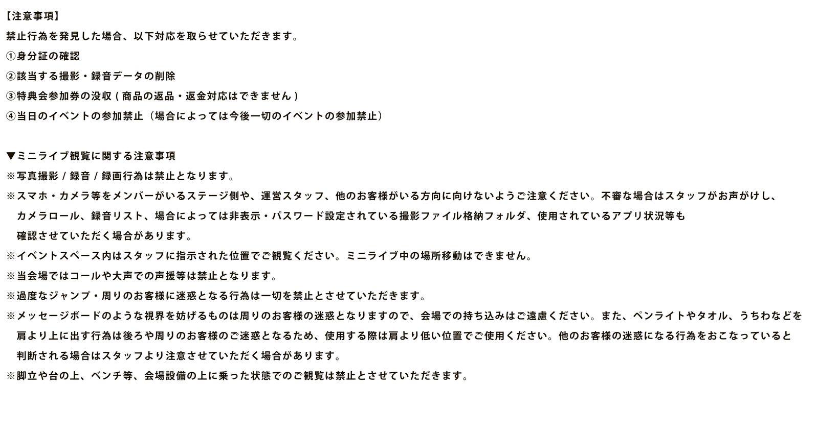 ※追加のご購入をご希望のお客様は再度お並びいただくことが可能となりますが、特典会参加券などは上限に達している場合もございます。あらかじめご了承ください。