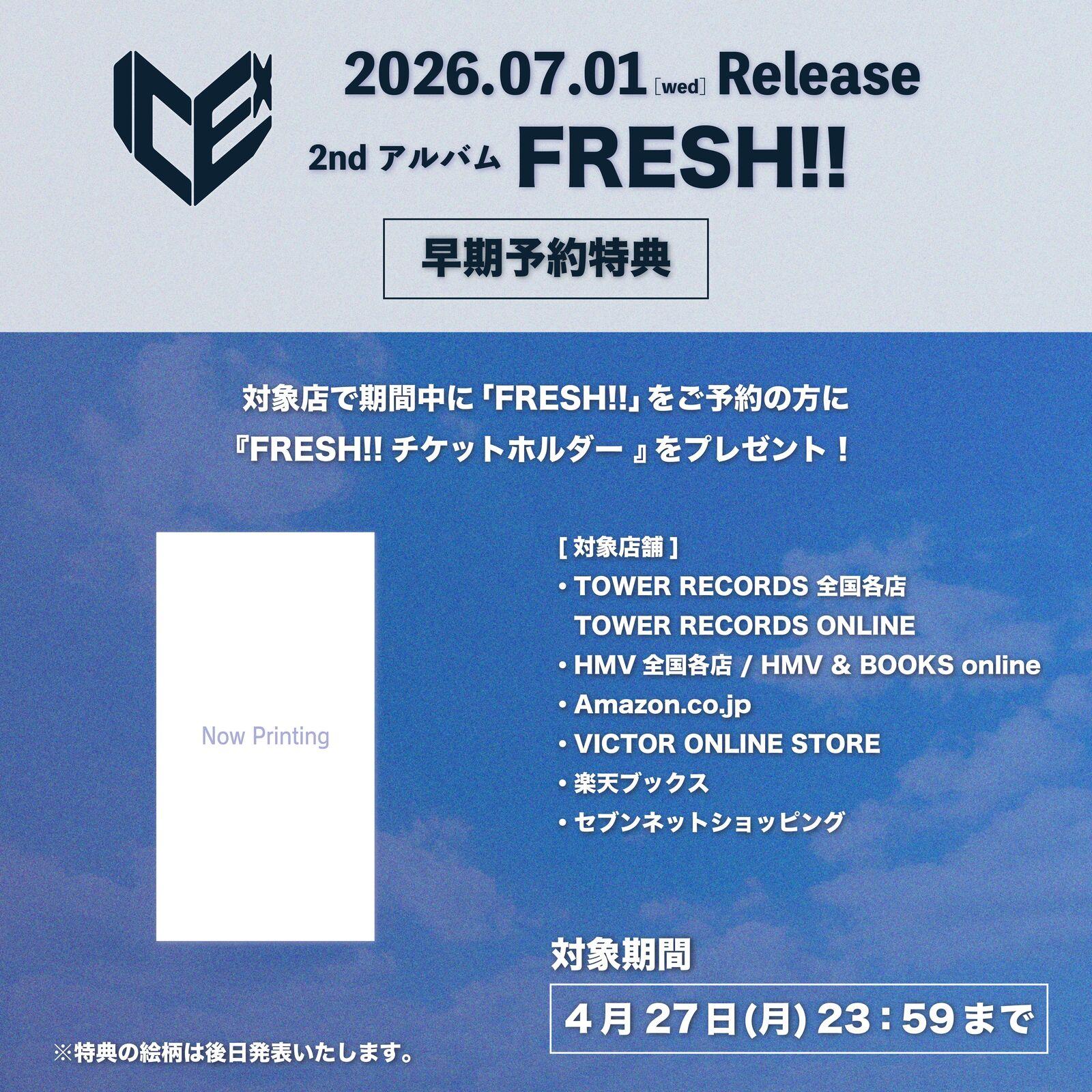 対象チェーン店舗・オンラインストアにて、ICEx 2ndアルバム「FRESH!!」を受付期間中にご予約いただいた方に、『FRESH!!チケットホルダー』をプレゼント致します。