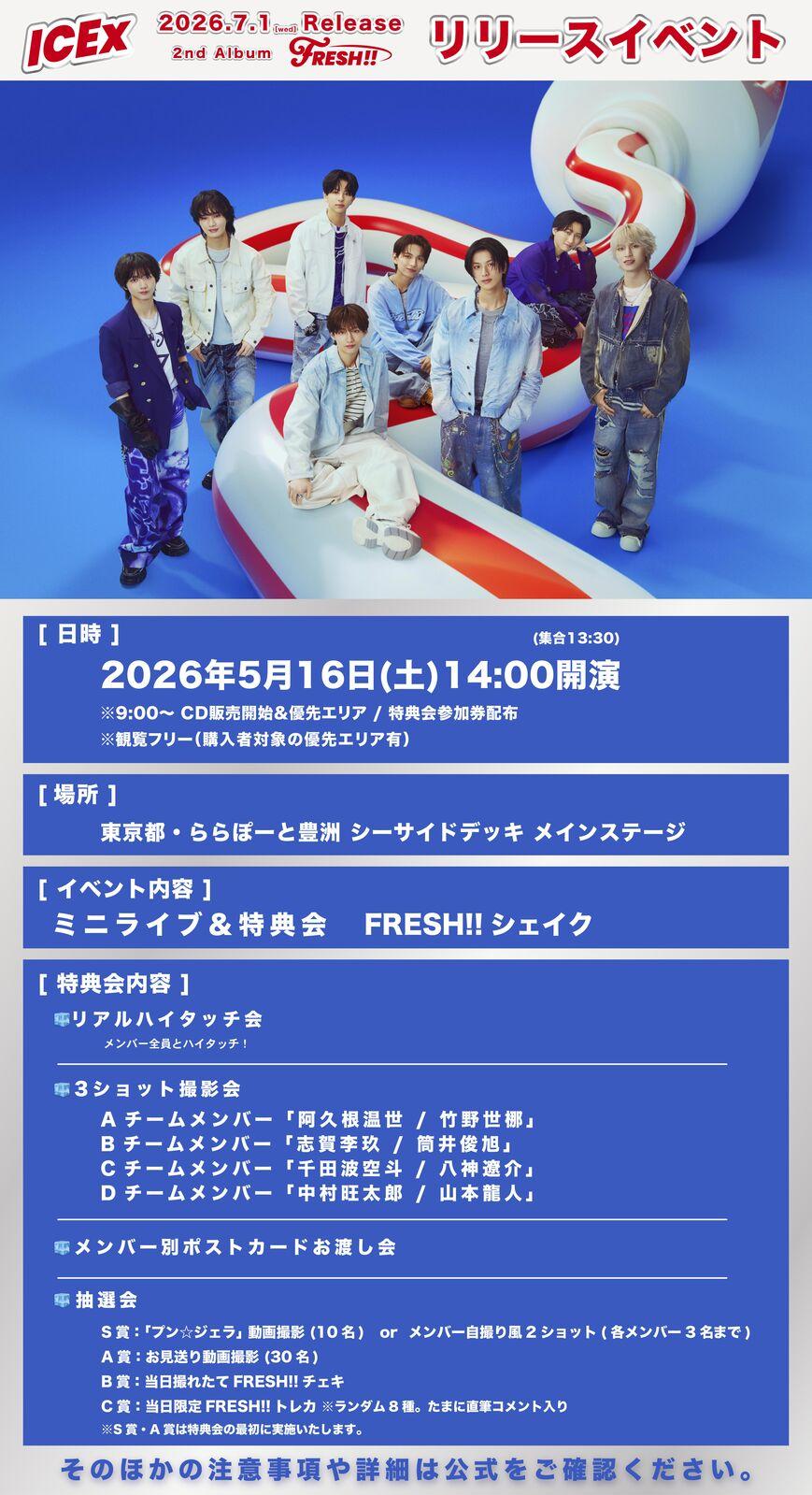 5月16日(土)開催のICEx 2ndアルバム「FRESH!!」発売記念リリースイベント「FRESHシェイク!!」の詳細をお知らせ致します!皆さまのご来場をお待ちしております。