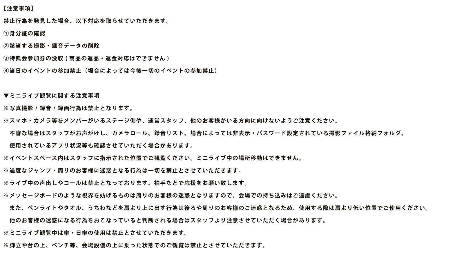会場にいらした皆様がイベントを楽しめるよう、ファンの皆様同士でルールとマナーの厳守をお願い致します。