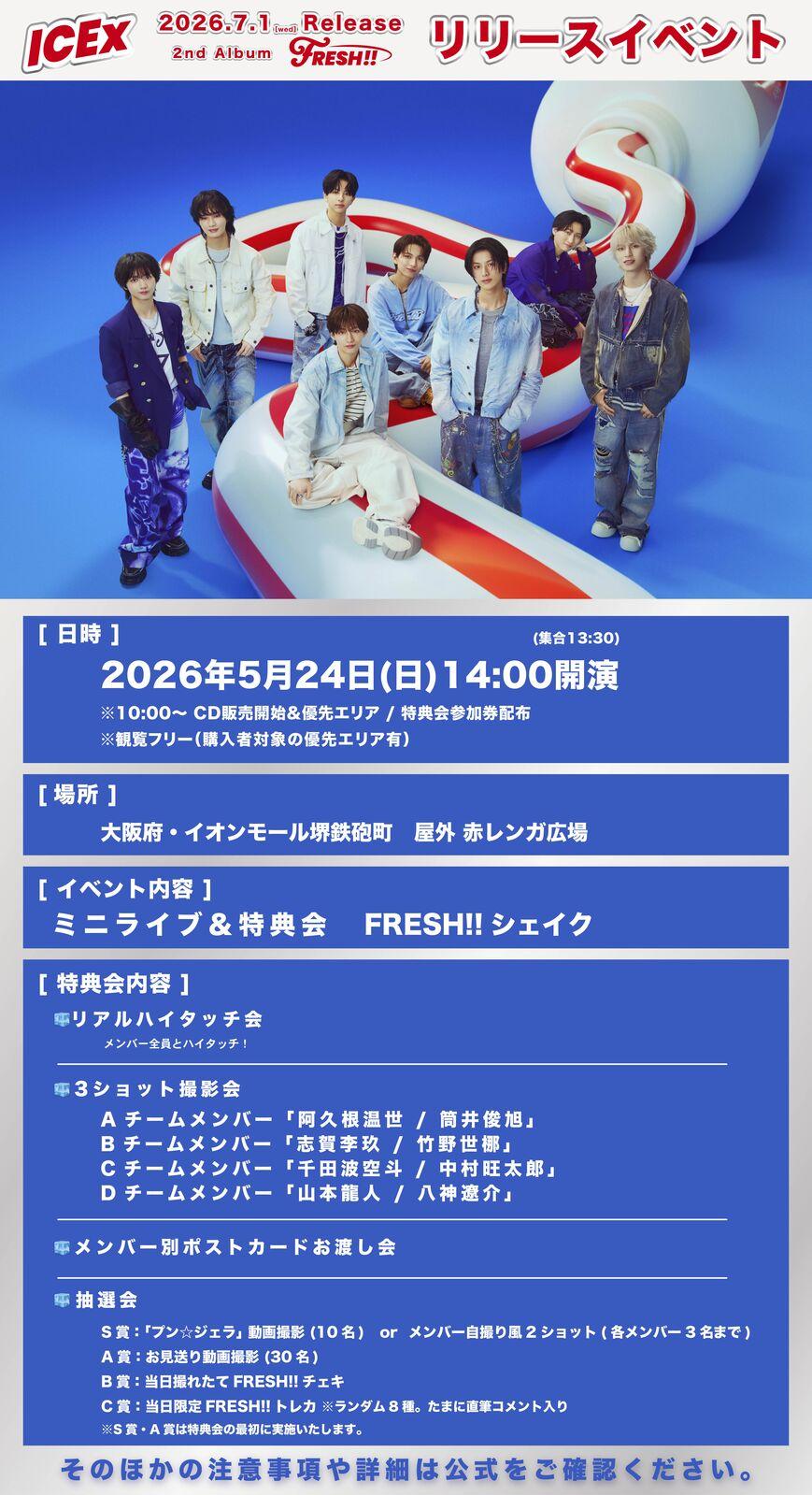 5月24日(日)開催のICEx 2ndアルバム「FRESH!!」発売記念リリースイベント「FRESHシェイク!!」の詳細をお知らせ致します!皆さまのご来場をお待ちしております。