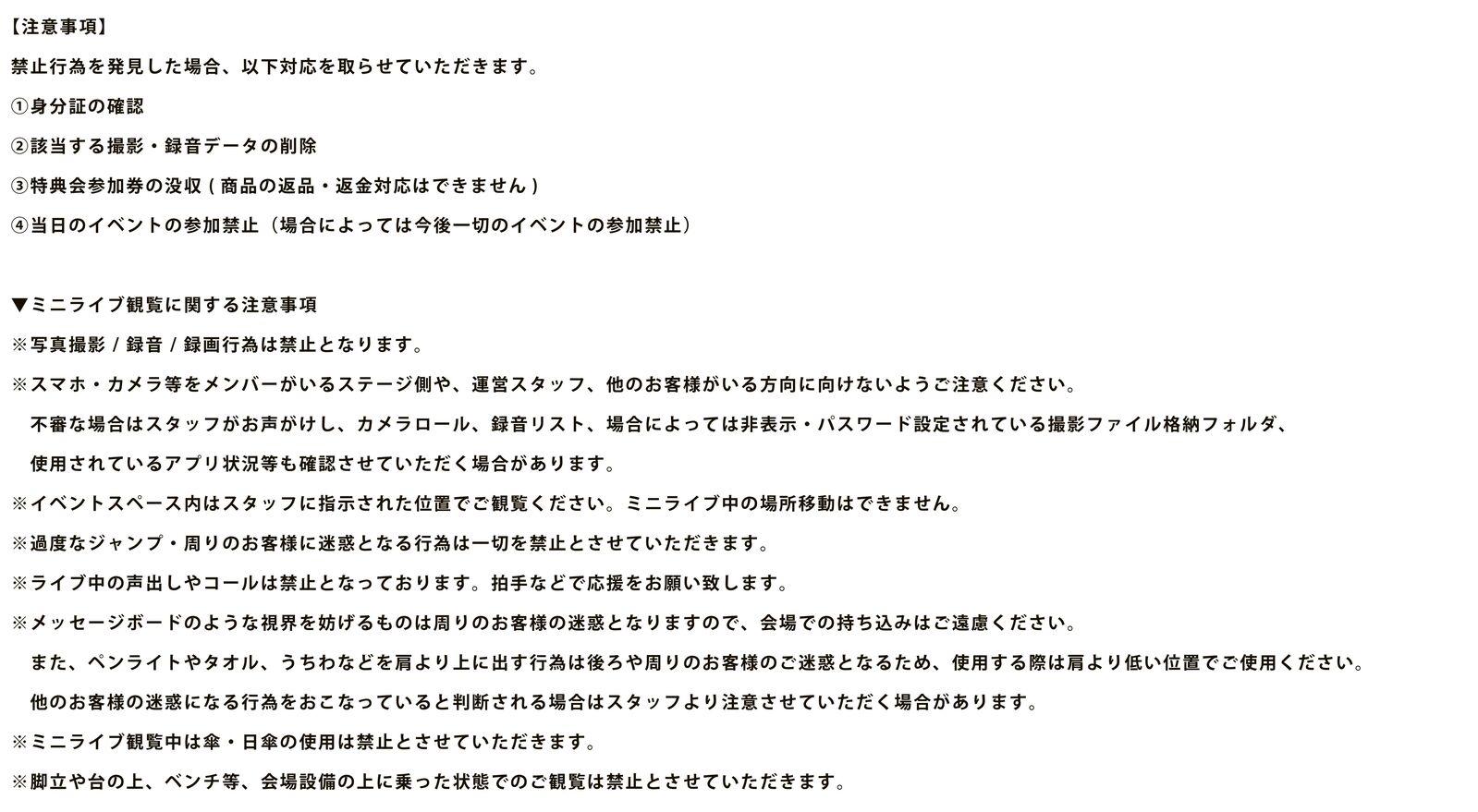 会場にいらした皆様がイベントを楽しめるよう、ファンの皆様同士でルールとマナーの厳守をお願い致します。