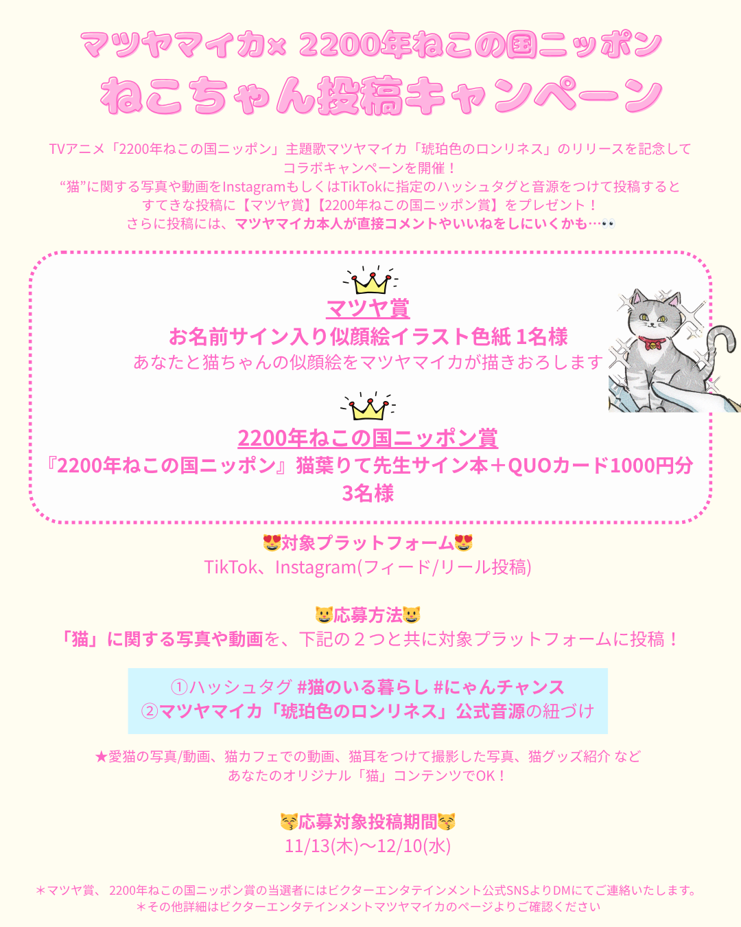 *マツヤ賞、 2200年ねこの国ニッポン賞の当選者にはビクターエンタテインメント公式SNSよりDMにてご連絡いたします。