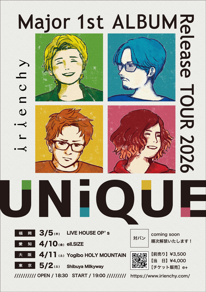 3月5日より福岡・愛知・大阪・東京の4都市を回る「irienchy Major 1st ALBUM Release TOUR 2026 “UNiQUE”」の開催を発表。