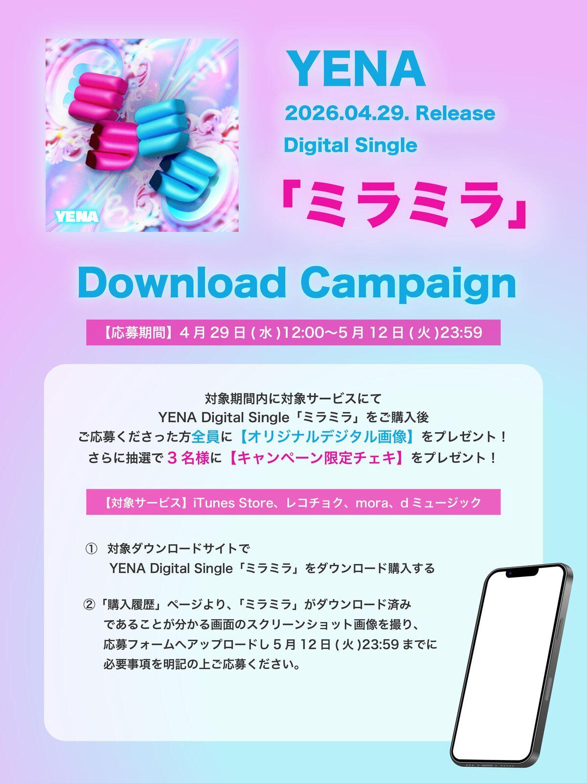 4月29日(水)YENA Digital Single「ミラミラ」の配信スタートを記念してダウンロードキャンペーンが決定しました!