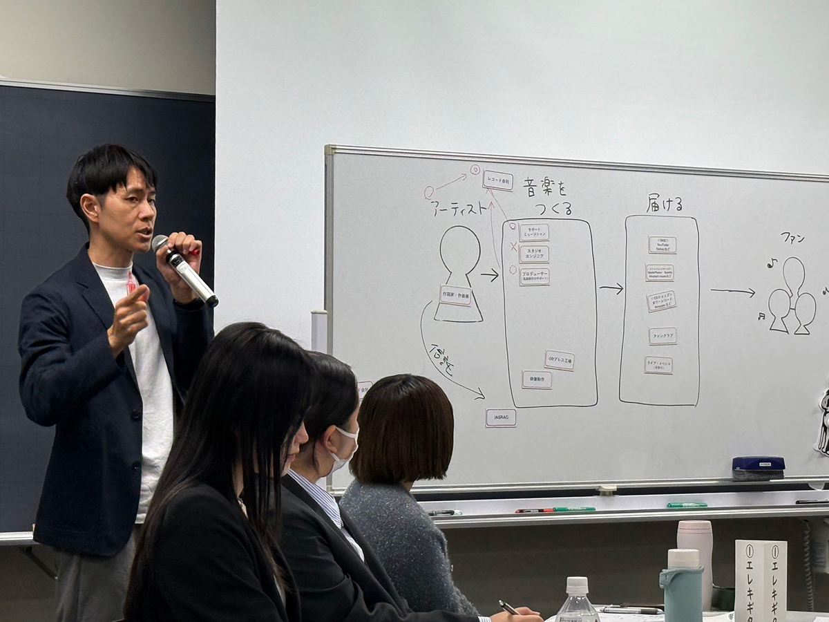 質疑応答では、音楽著作権に留まらず、音源の取り扱いについてや、音楽ビジネスの構造に関する質問も多数寄せられ、学生の高い関心がうかがえる時間となりました。